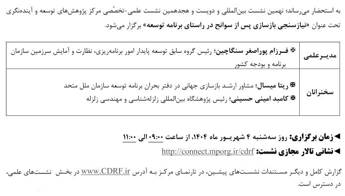 نشست علمی نیاز سنجی بازسازی سوانح در راستای برنامه توسعه ۰۳ شهریور ۱۴۰۴ | ۱۲:۳۷ کد : ۵۴۰۰۰ اطلاعیه ارسال به دیگران نام شما ایمیل شما ایمیل دریافتکننده ارسال انصراف تعداد بازدید:۱۶۴۰ نشست علمی نیاز سنجی بازسازی سوانح در راستای برنامه توسعه، توسط مرکز پژوهش های توسعه و آینده نگری برگزار می گردد.